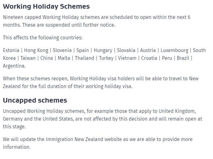 Os dezenove visto de férias de trabalho limitados estão programados para abrir nos próximos 6 meses. Estes estão suspensos até novo aviso.